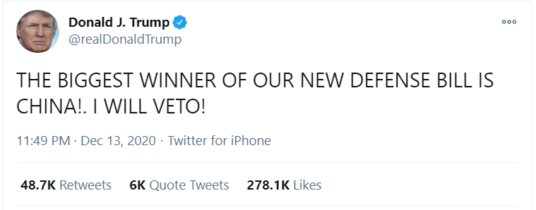 近日,美国联邦参议院、众议院陆续通过了美国2021财年国防授权法案。13日,特朗普在推特发文声称要否决这份法案:“中国会是我们新国防法案的最大赢家!我要否决!”