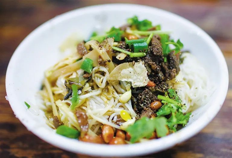 而腌制的抱罗粉,加上牛肉干、牛杂、花生、竹笋等配料,和浓郁的卤汁浇相融合,入口即化,细细品尝却又能感受到一股韧劲。
