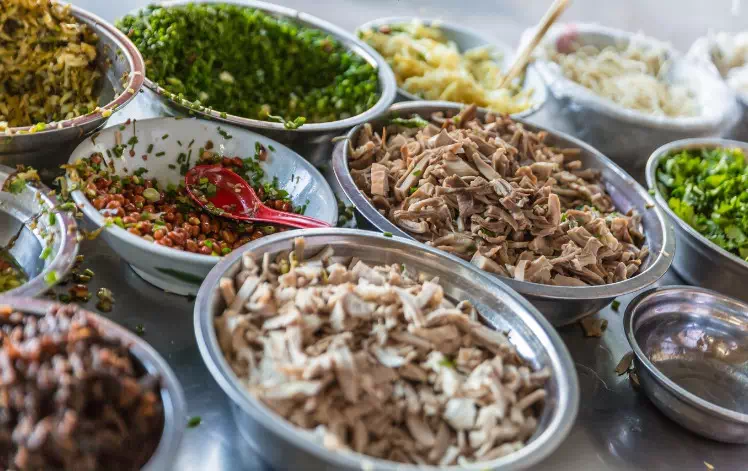 豆芽、酸菜、竹笋、猪肉丝、牛肉丝、爆花生米、葱花、香菜……