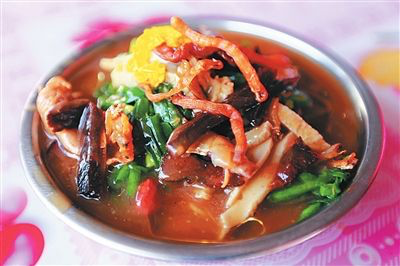 在粗粉中加进滚热的肉汤,撒上少许葱花、爆花生米等,喜欢海鲜口味的,还会加虾肉和海白。