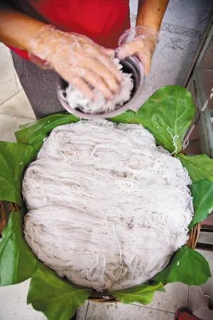 其实,最好的粉须是纯手工的漏粉,用特殊的网具挤压而成的细米粉,可惜,现在市场上很难吃到。