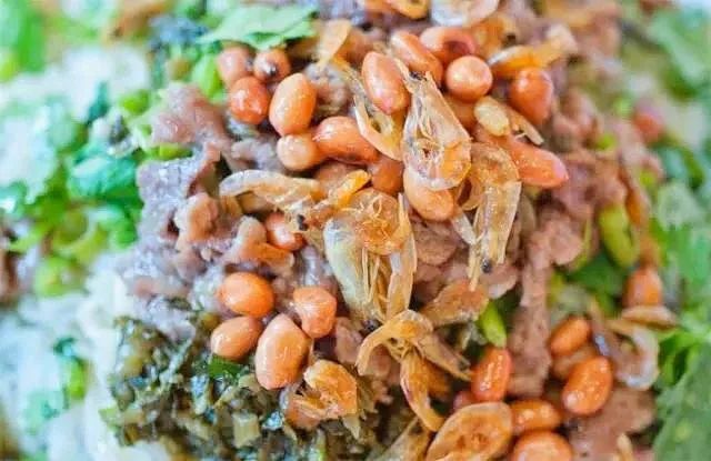 大料中有牛肉干、花生粉、猪腩、炸虾米、鱿鱼干、豆角、酸菜;
