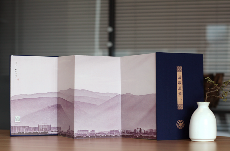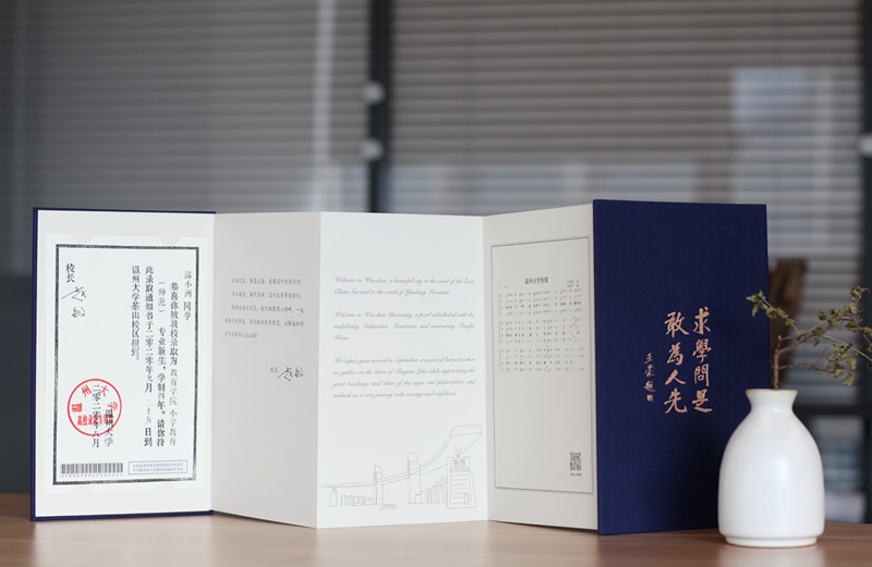 在温州大学本科招生录取现场,一本本蓝色烫金的录取通知书正整整齐齐得摆放在会议桌上,整装待发。通知书整体采用中国传统文书褶子样式,封面是烫金的“录取通知书”和学校校徽,封底是王蒙题词的校训“求学问是,敢为人先”。展开五折折页,正面分别是瑞安市东源村木活字传承人亲手印刷的录取证书页、校长寄语、校歌,背面则是以温州地理标志大罗山为底、温大建筑为前景的山水画卷。