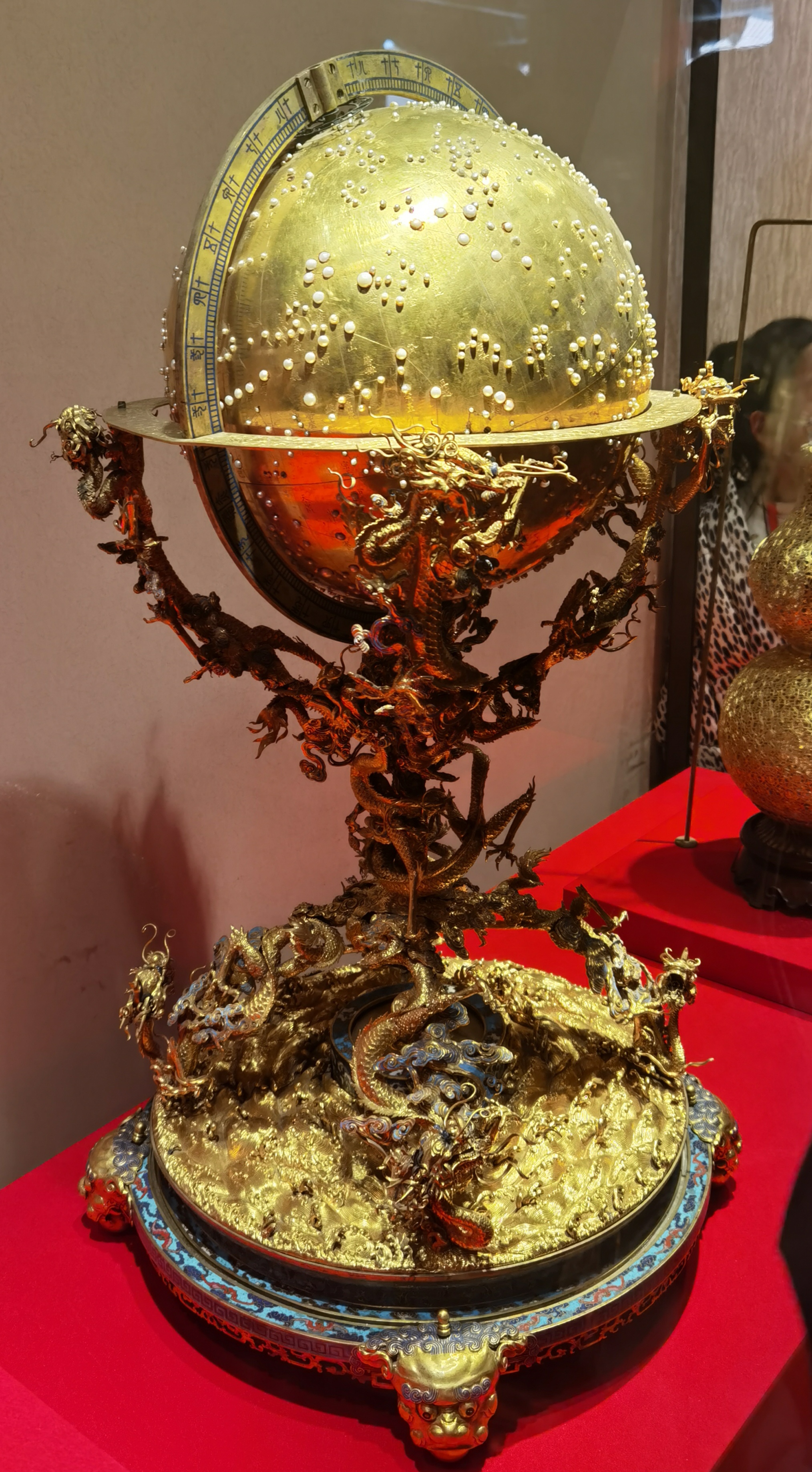 金嵌珍珠天球仪是清代乾隆年间内务府造办处用纯金打造的模型。天球仪由座、支架和天球三部分组成。并阴刻紫薇垣、天市垣和太薇垣。据乾隆年间的《仪象考成》记载,天球仪有三垣、二十八宿、三百六十八星座,一千三百三十颗星。同时球面还有黄道、赤道、银河、二十四节气、北极还有时辰盘。天球仪的支架成高脚酒杯状,用9条不同姿态的行龙支撑球体,上为4条头上尾下的腾龙擎住球体,下为头下尾上的倒海翻江的降龙,形成支架稳固球体,中间一龙连结上下部分,成游龙抱柱状。9条行龙采用锤牒法,形成中空的圆雕,龙的表面则以抽丝法形成龙鳞、龙髯、龙睛的纹饰。行龙吞云吐雾,形态生动,细部錾雕精细,栩栩如生。球仪的基座为圆形珐琅盘底座,通体以细丝盘出缠技花纹,嵌以烧蓝和淡蓝的珐琅釉,以丰富多彩的色调改变了纯金的单调。景泰蓝座足又以四个龙首为形,采用高浮雕法,极富装饰性。底座盘上是奔腾的海水波浪,座上有东、南、西、北四象字,座心为罗盘(指南针)。