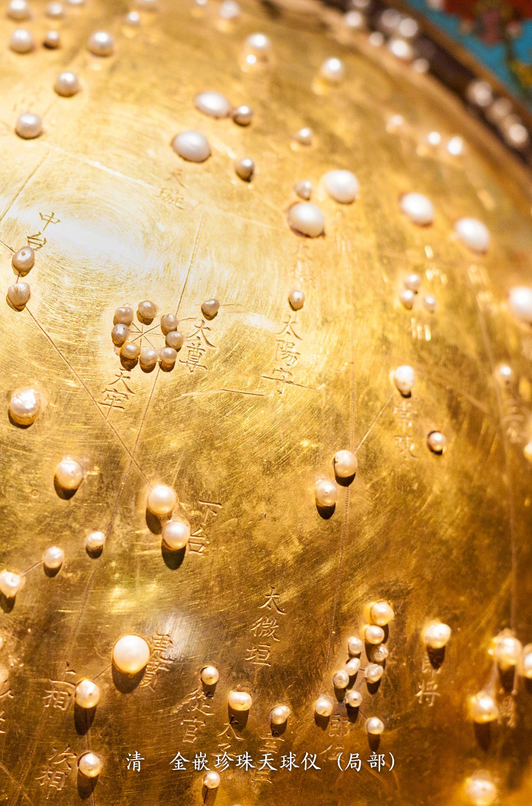这件天球仪的特点是上面的星象应该说引进了西方的星等,天球表面以阴刻及珍珠镶嵌的方式布列星图,每颗珍珠都代表一颗天上的恒星。我们可以看到上面的珍珠有大有小,珍珠越大,所代表的星就越亮,然后依次的往下降,最小的是天上的6等星。从这个仪器可以看出中西方文化相互交流的特点。