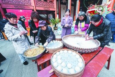 12月25日,村民们在环二村文化礼堂内参加“做塌饼”活动。 新华社记者 徐昱摄