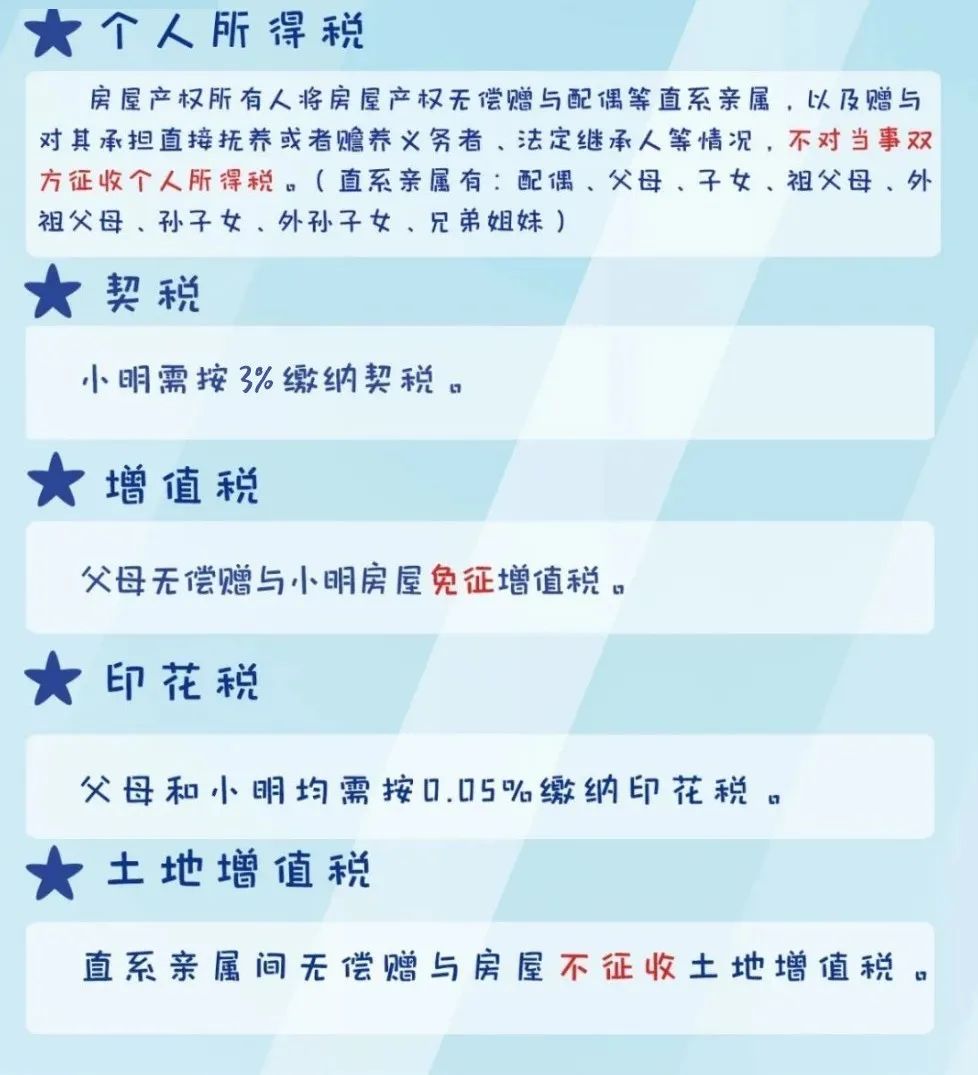 个人所得税:按照《财政部国家税务总局关于个人无偿受赠房屋有关个人所得税问题的通知》(财税〔2009〕78号)第一条规定,符合以下情形的,对当事双方不征收个人所得税: