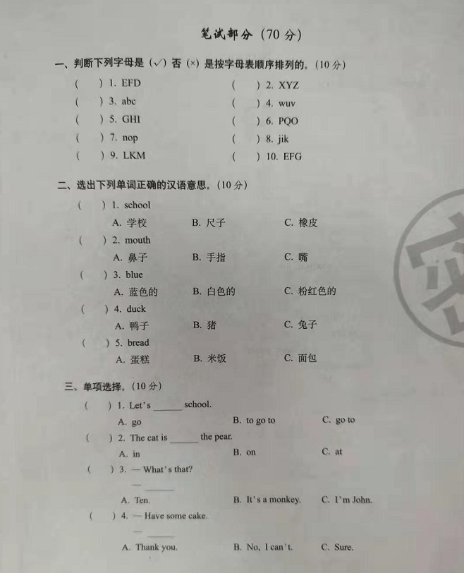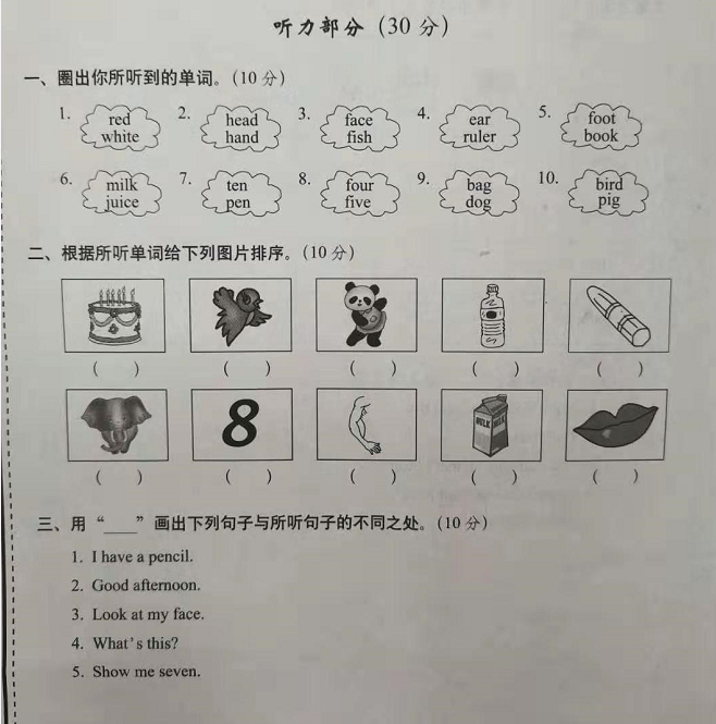 三年级英语上册期末测试题,听力30分,笔试70分,含试卷答案