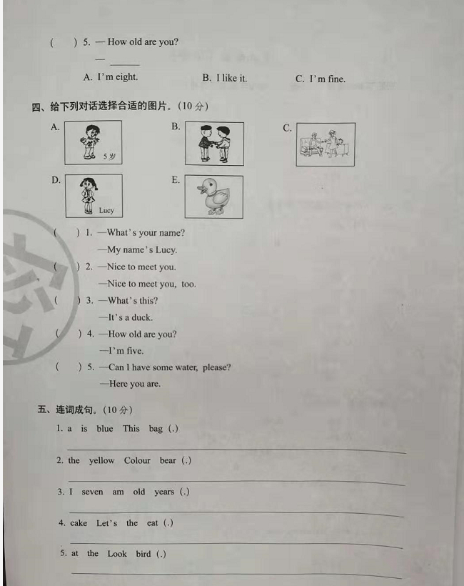 在第四大题中看图选择合适的短语对话,要求学生能明白图片中场景的表达故事是怎么样的,另外就是找出图片中的关键点,然后就和给出的例句进行分析即可。比如在第一张图中有一个5岁,所以和年龄有关的对话就是问对方你多大年纪了?我5岁了。看图选择和写话中关键是找出图中的关键点。