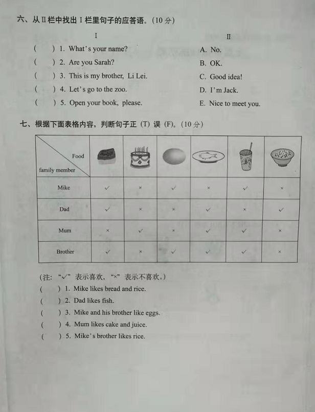 在第七大题中先读一遍题目要求,根据表格内容判断句子是否正确,比如第一小问中Mike喜欢吃哪些食品,先找到Mike在哪里,然后就是分析Mike喜欢那些食品,所以打对勾的就是Mike喜欢的,第一个就是面包,还有鸡蛋和果汁这三样食品。以此类推找出其他的家庭成员的饮食习惯即可。