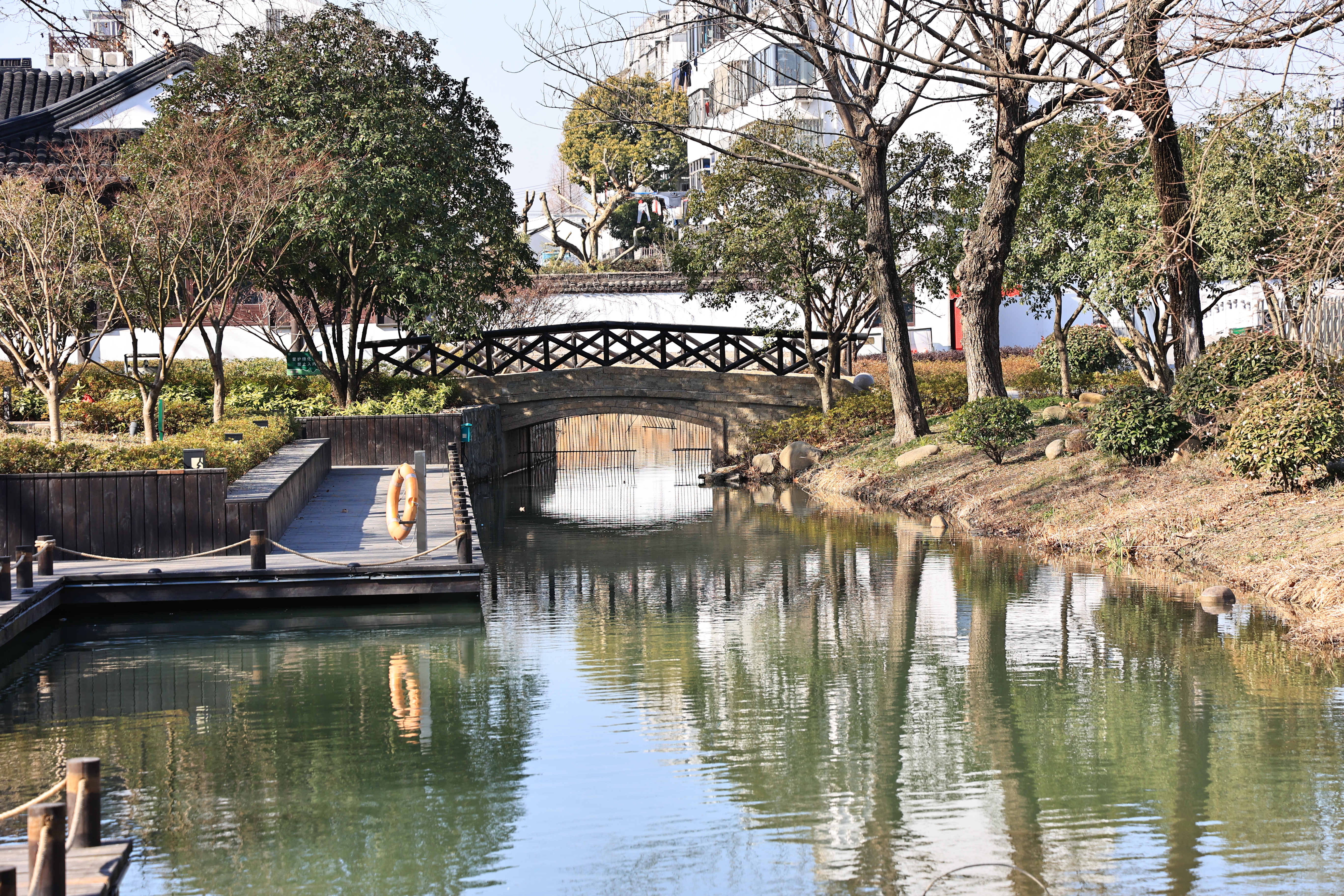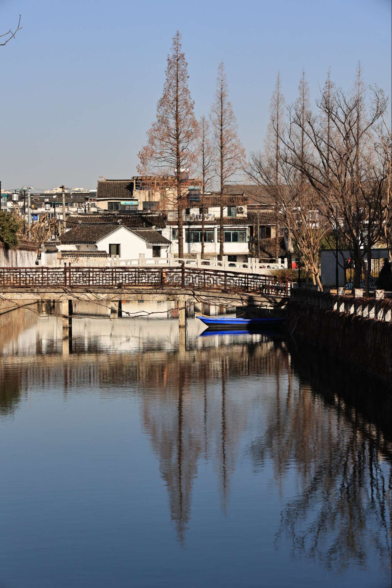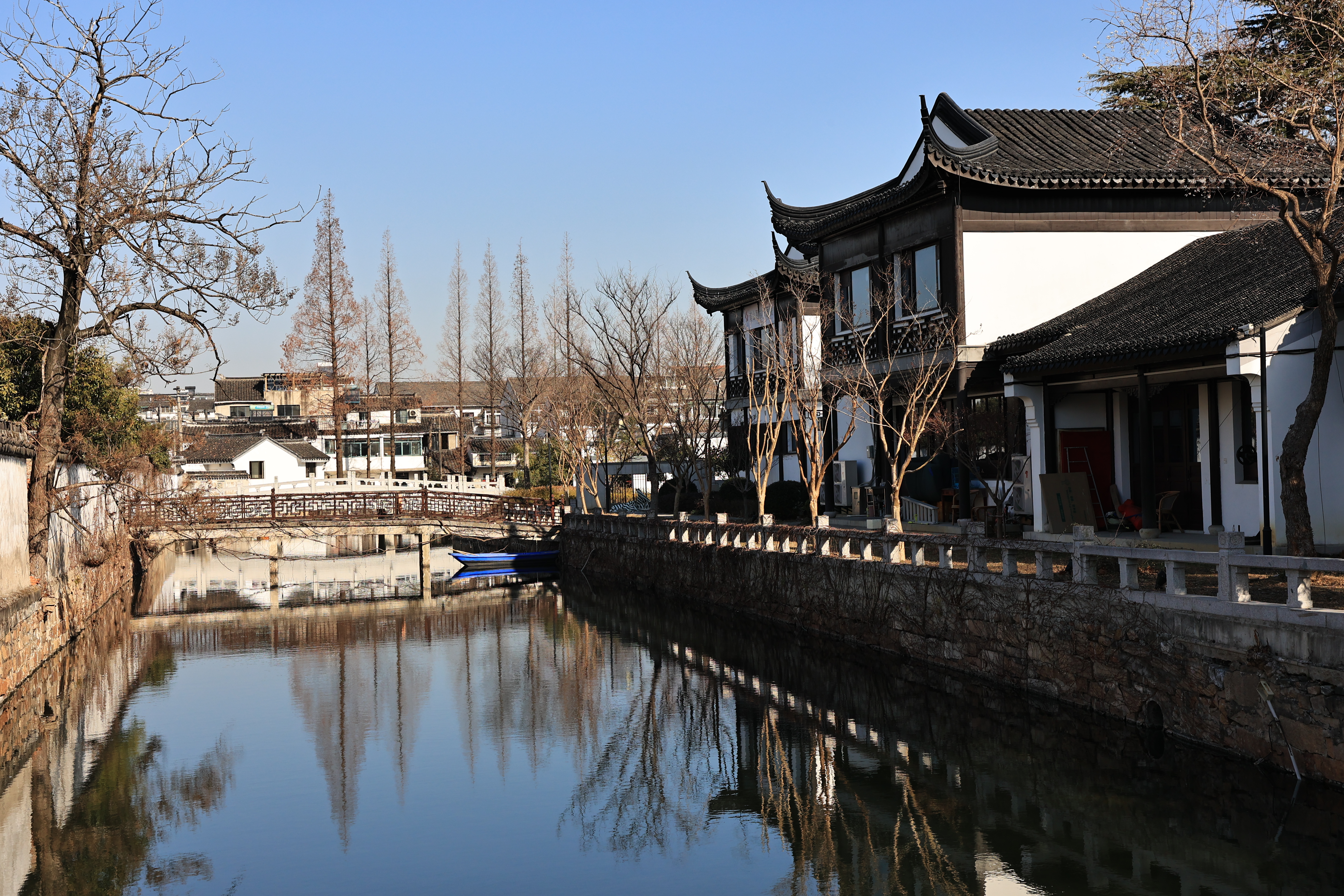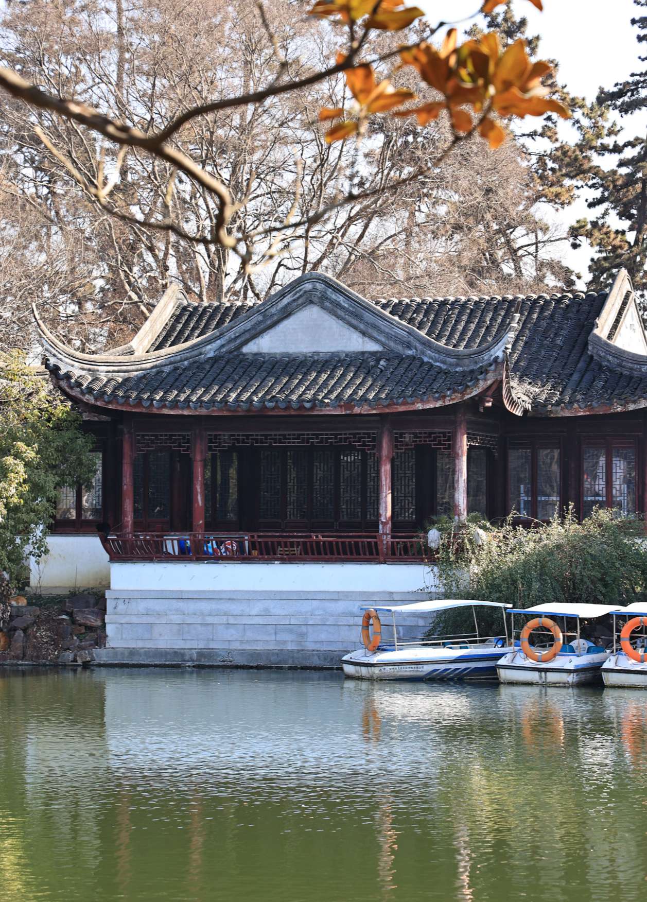 河道上摆放了几十艘小船,春夏季节适合划船赏景,泛舟荡漾水面,使人心旷神怡,只是现在气温较冷,没有人划船。