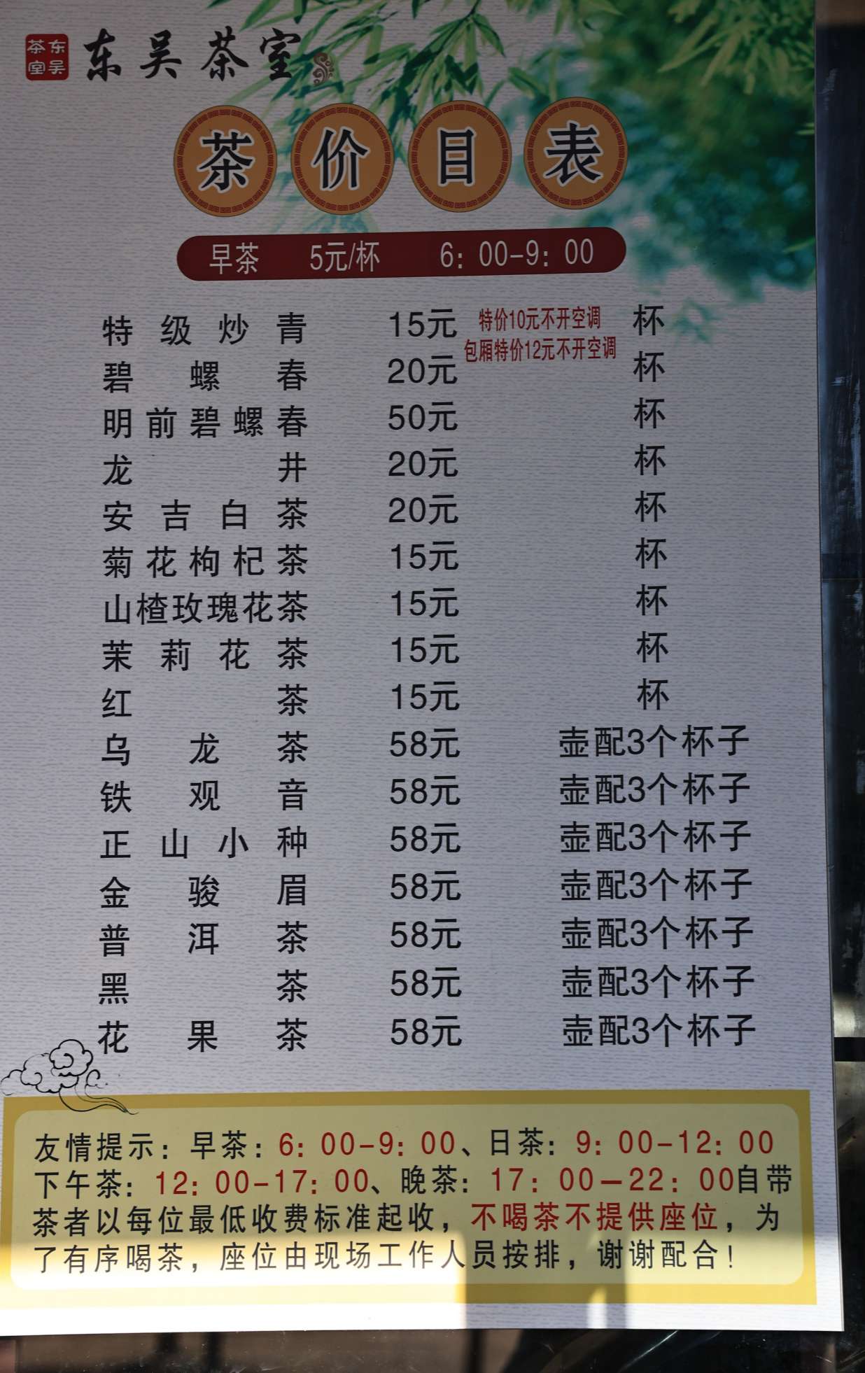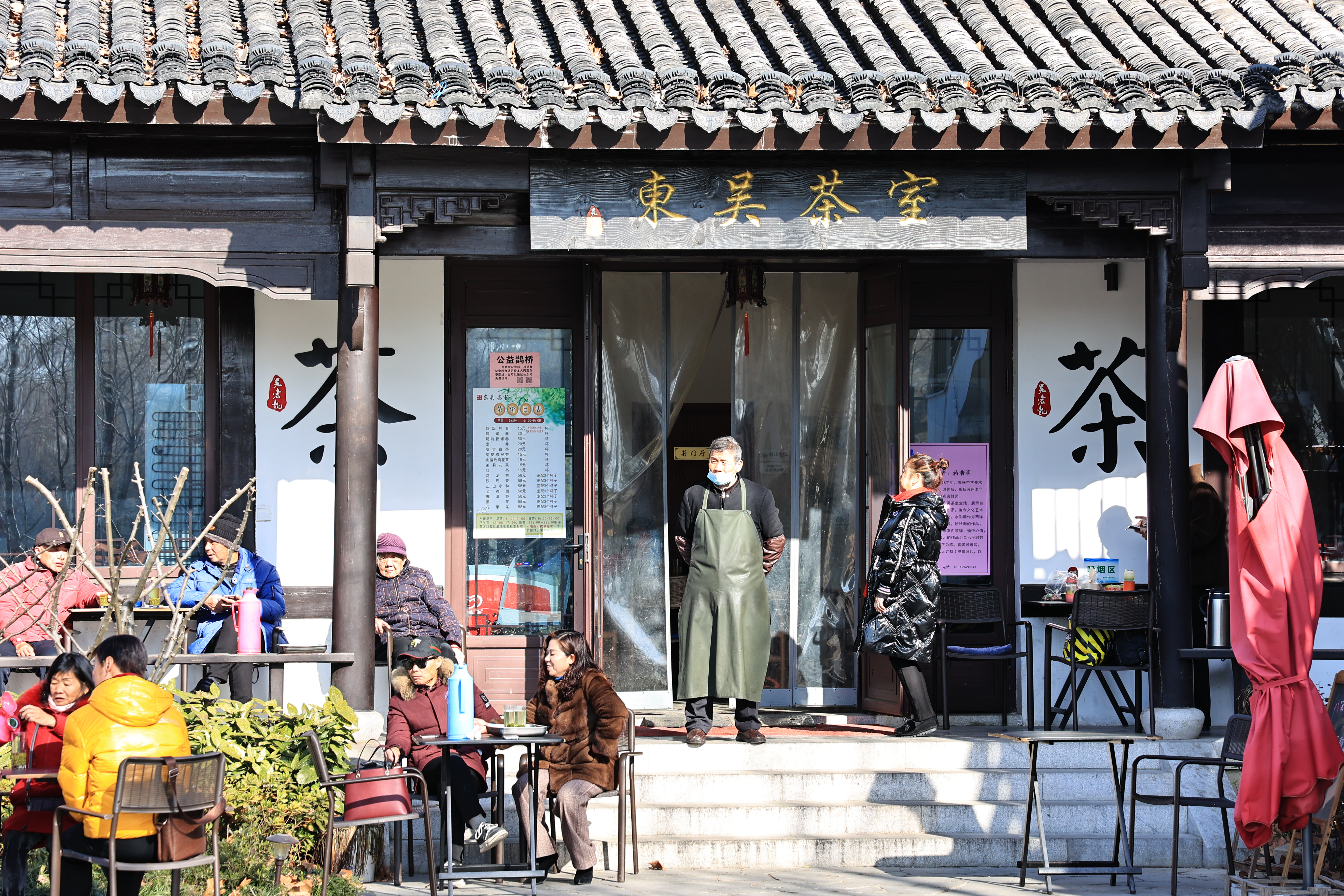 东园北侧有间东吴茶室,看样子很火,里里外外坐满了喝茶的人。我前去看了下价格,早茶5元一杯,时间为早6点—9点,这太便宜了,什么年代了还有5元一杯的茶。
