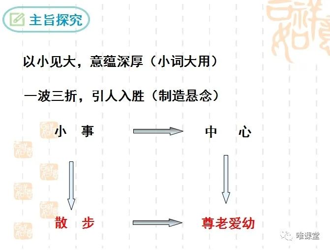 本文通过一家三代四口人一起散步的小事,表现了家庭成员间互相谦让爱护的浓浓亲情。其中尤其体现了中年人赡养老人和抚育儿女的使命感和责任感。