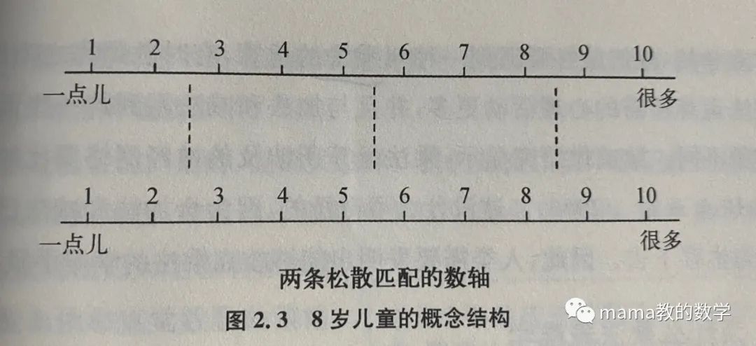在《人脑是如何学数学》一书中讲到,孩子对数字概念结构的发展大约每两年就会发生一次认知结构的重大变化。6岁左右的儿童能发展出心理数轴的概念,能在轴线上进行加减运算。到8岁左右,理解数位的概念,可以在松散匹配的两条数轴上操作数字,开始心算两位数的加减。