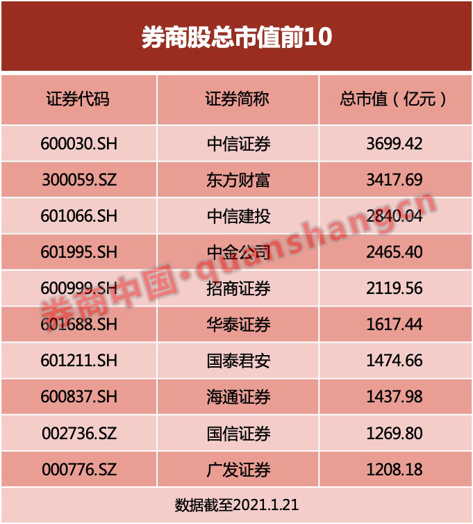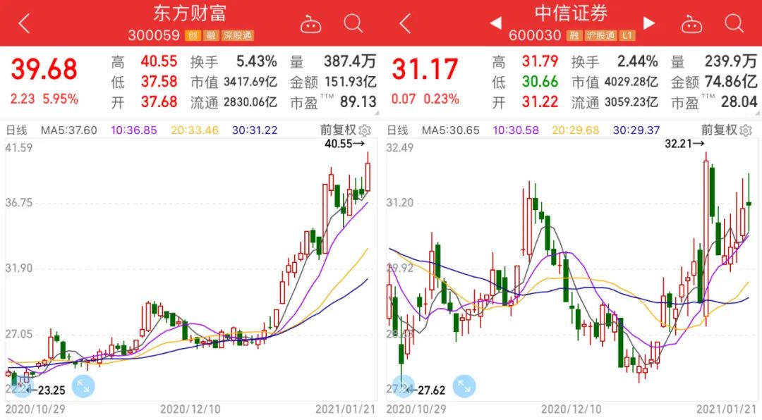 1月21日,东方财富单日上涨5.95%,股价再创历史新高,公司市值达3418亿元。仅对比A股市值,当日东方财富已超越国内券商一哥中信证券。