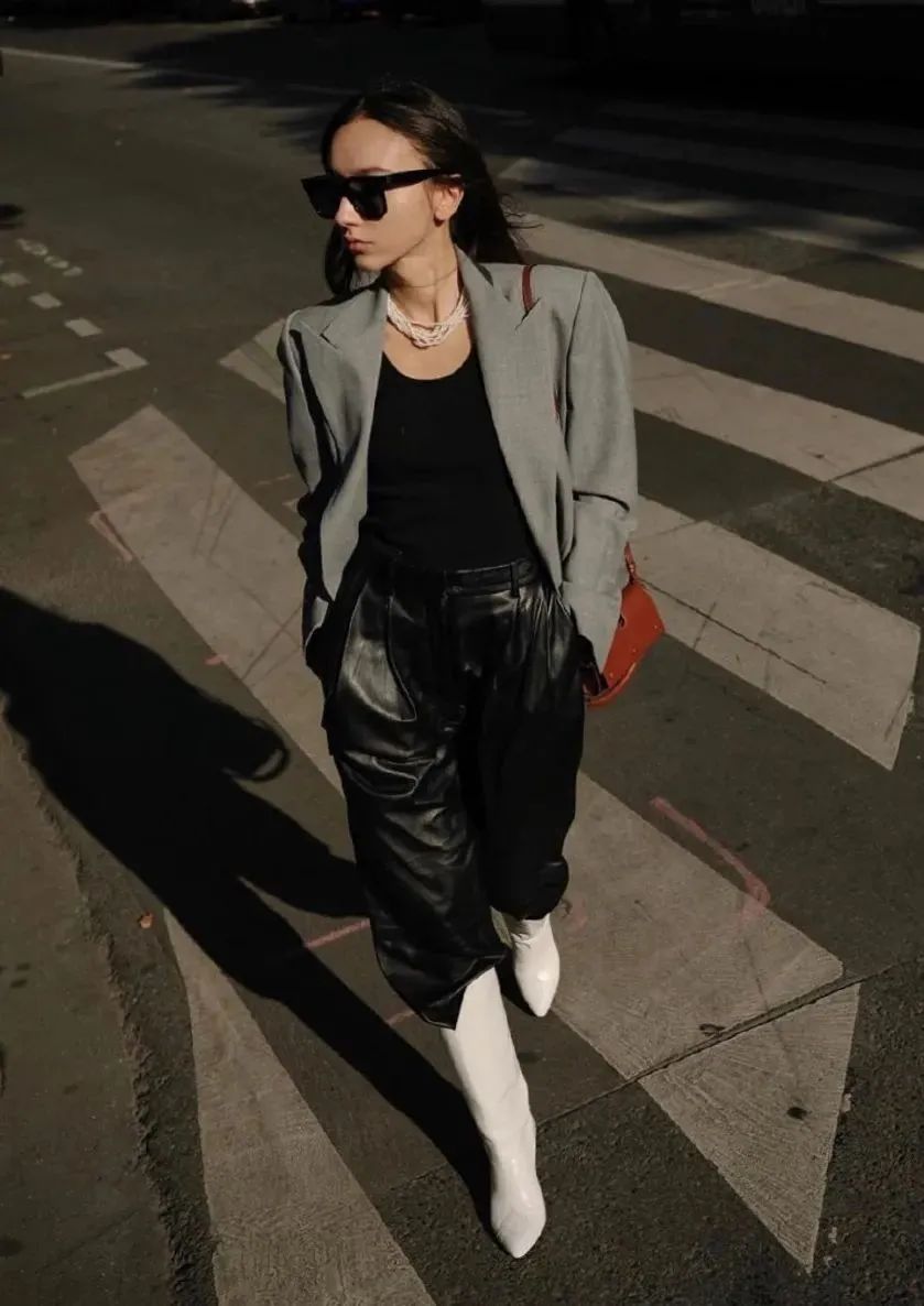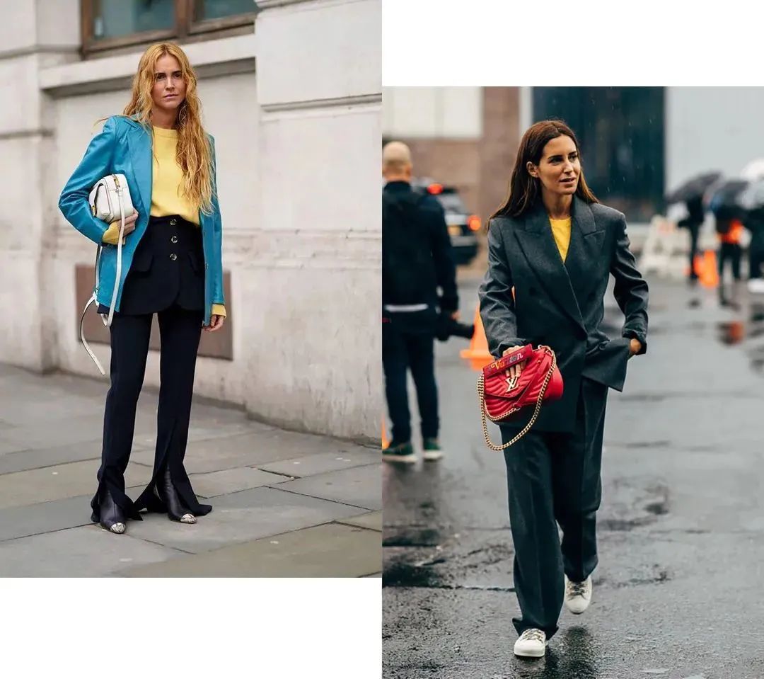 像西服+半裙or裤装成套穿时,与运动鞋组合在一起酷甜减龄,或是直接与气质短靴混搭,便能成就另一番美景。