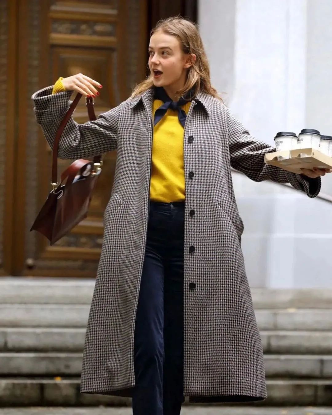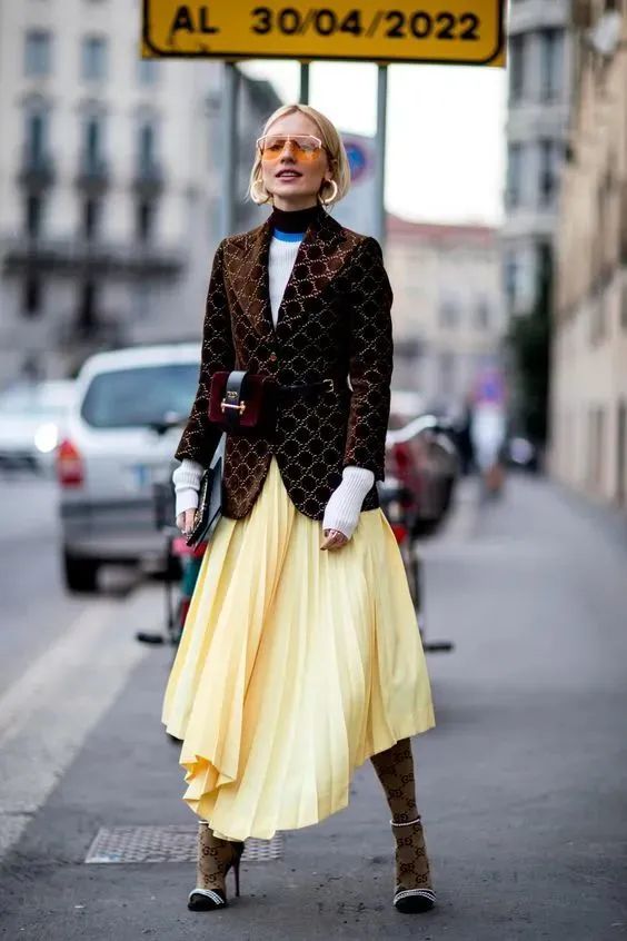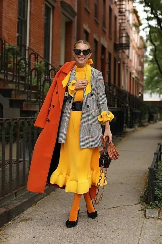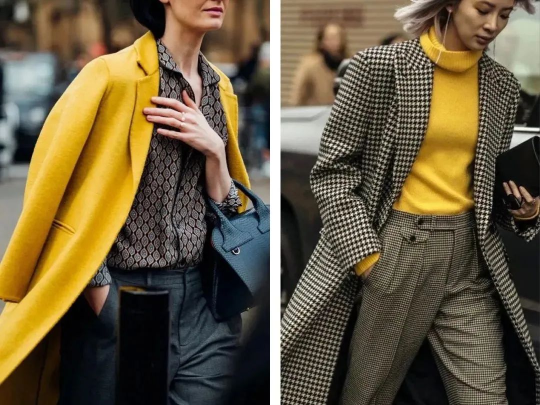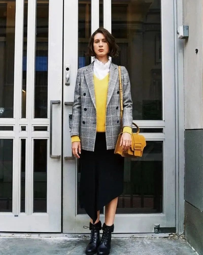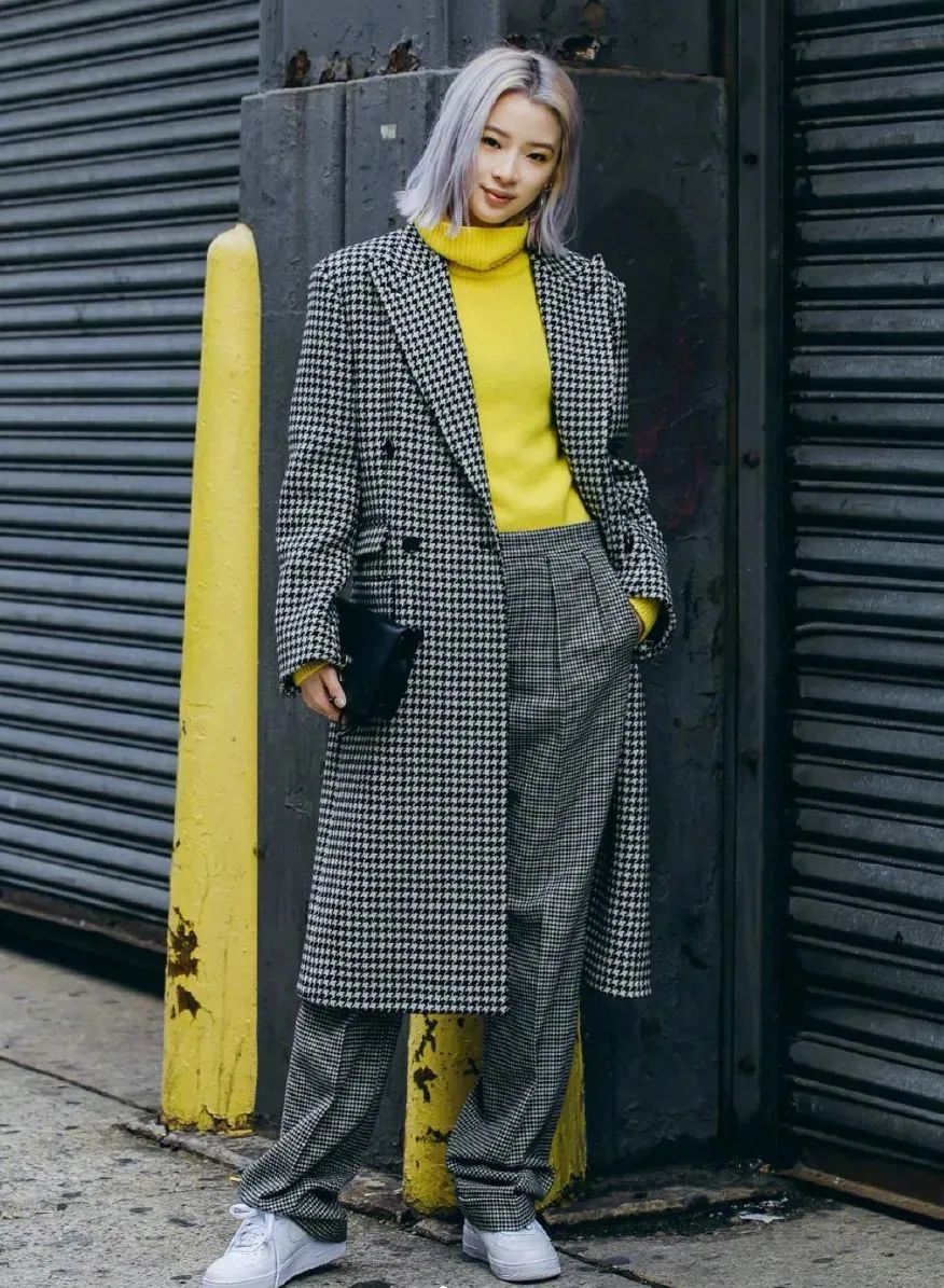当黄、灰作为穿衣主色时,格纹印花的合理搭配,可以调和颜色的冲撞性。棱角分明的西服套装,在明黄色的衬托下更加闪耀,在灰色的加持中更为日常,易穿着,优雅中不乏活力感。自带几分应时应景的冬日复古感,慢悠悠的黄色调,打造甜酷皆宜的独特style~