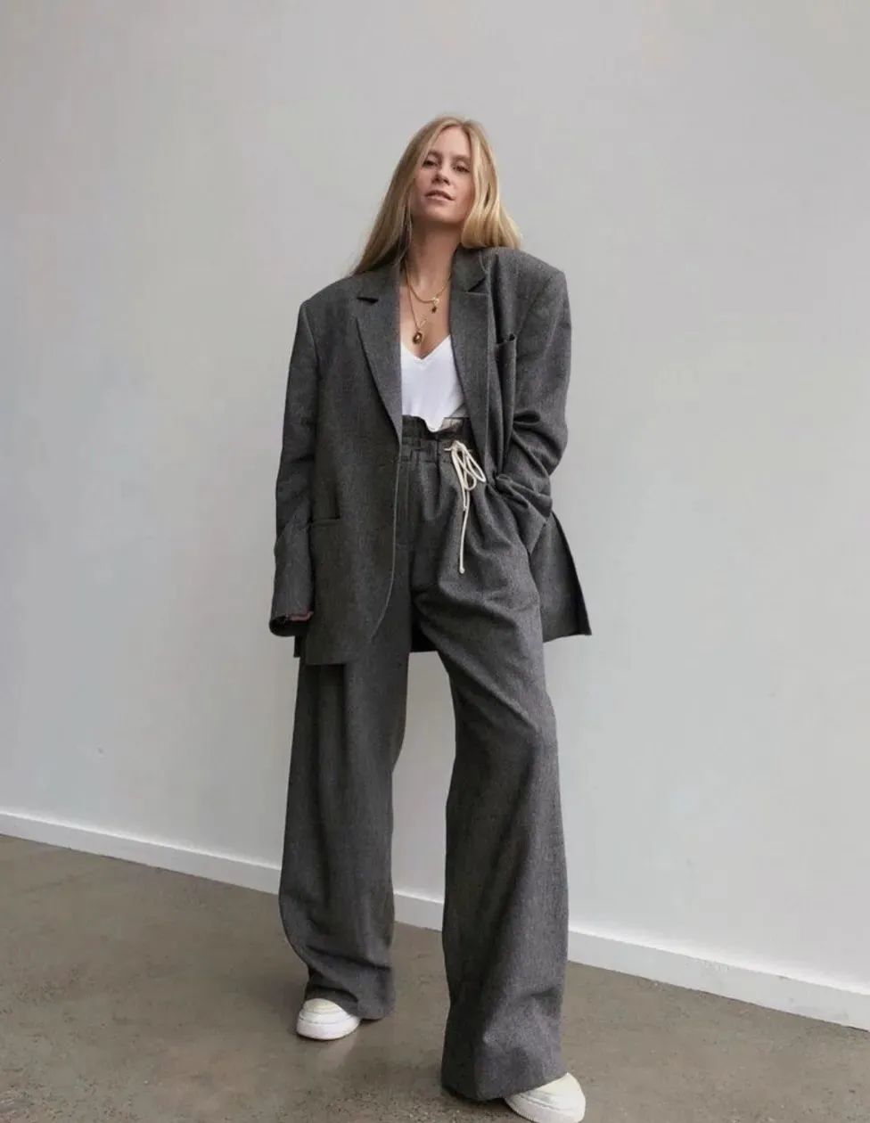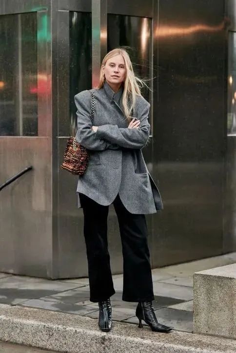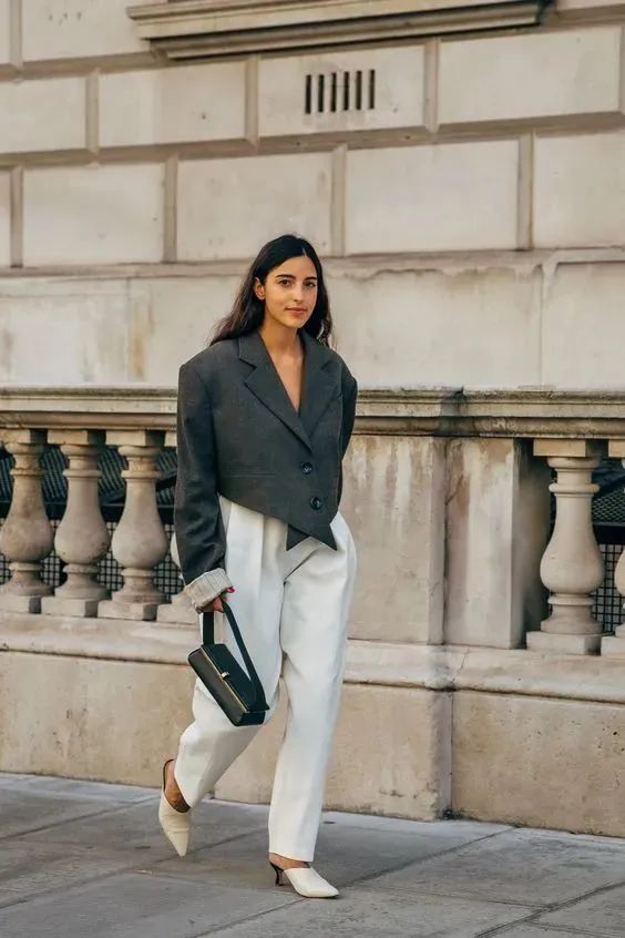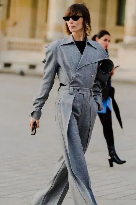 众多周知风靡四季的西服绝对是潮流风向标典范,将西服的英气飒帅与极致灰的简约洒脱联合在一起,混搭白色裤装清甜知性的穿衣韵味,很是撩人。