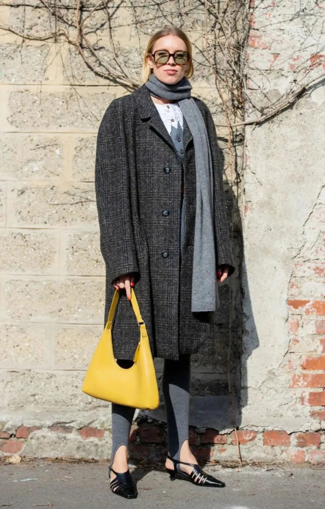 如果穿衣总是低调简约,一身灰色,加一点暖调的黄,就能让原本晦暗的场景变得不一样。适当调节颜色比例,可以轻松打造氛围感,让冬天更添暖意。
