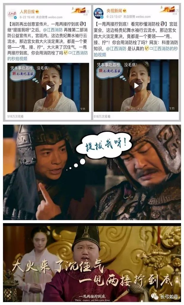 为宣传正确使用消火栓,他们用唐代宫廷作为故事背景,拍摄了《凭本事吃荔枝》。贵妃表演水袖舞,而其中最有特色的三个动作—“甩”“接”“拧”,恰恰契合了消火栓的使用动作。火灾突发,勇敢的宫女立马用消火栓演示起与水袖舞如出一辙的动作,三个动作被进行了二次强化。