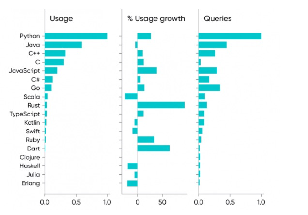 从编程语言的使用情况来看,Python 的使用量是最高的,与去年相比还上升了 27%。排在第二位的是 Java,比去年下降了 3%,第三是 C++,比去年上升了 10%。第四和第五分别是 C 和 JavaScript,使用量分别上升了 12% 和 40%。