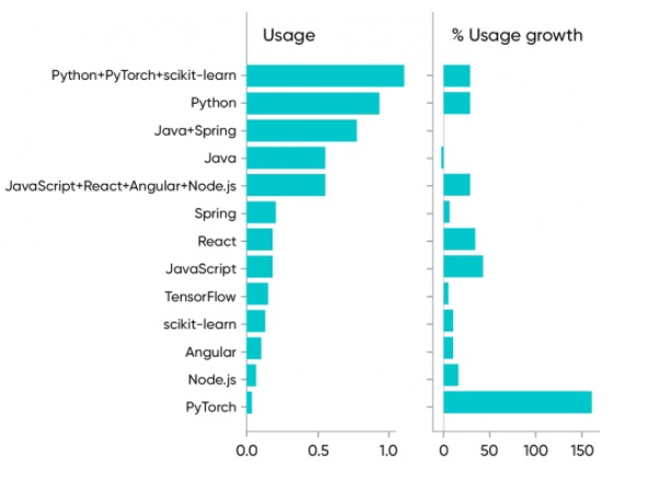 TensorFlow 是机器学习平台中的领导者,搜索次数最多,使用率稳定在 6% 。Python 的机器学习库 scikit-learn 的内容几乎同样被大量使用,年增长率为 11% 。PyTorch 位列第三,但是 PyTorch 内容的使用量同比增长了 159% 。毫无疑问,这种增长是受到 Jeremy Howard 的《面向程序员的实用深度学习》课程和基于 PyTorch的fastai 库的普及的影响。看起来 PyTorch 在研究人员中更受欢迎,而 TensorFlow 在生产中仍占主导地位。但是随着 Jeremy 的学生进入工业领域,随着研究人员转向生产岗位,我们希望看到 PyTorch 和 TensorFlow 之间的平衡发生转变。