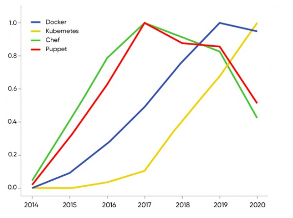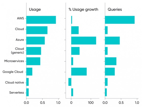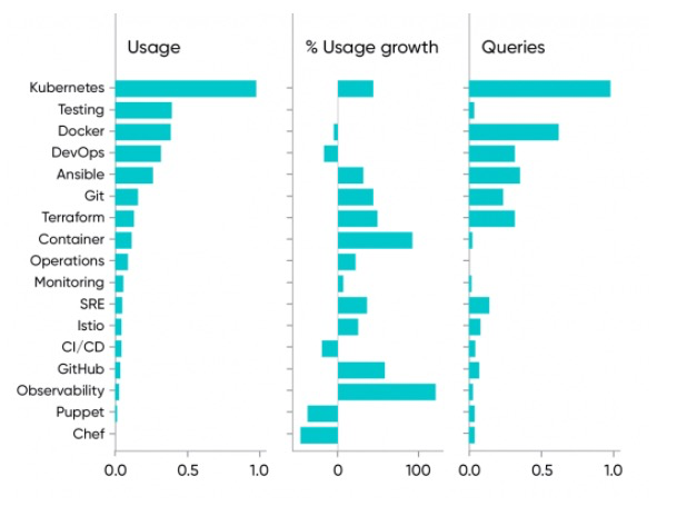 有趣的是,从数据来看,Docker 几乎没有变化(每年下降5%) ,但是关于容器的内容使用率却飙升了 99% 。所以,容器化显然是一件大事。Docker 本身可能已经停滞不前了,但是 Kubernetes 作为容器编排工具的主导地位使容器处于中心地位。Docker 是使能技术,但是 Kubernetes 使得大规模部署集装箱成为可能。