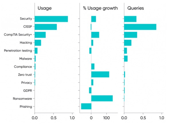 除了这些类别之外,我们还看到了长尾效应,网络钓鱼和勒索软件等特定主题的内容只有极少的使用,尽管勒索软件的使用量同比增长了 155%。这种增长无疑反映了过去一年勒索软件攻击的频率和严重程度。“零信任”(zero trust)的内容也增加了 130% ,这是一种用于建立可防御网络的技术。不过,这种技术的使用量仍然很小。