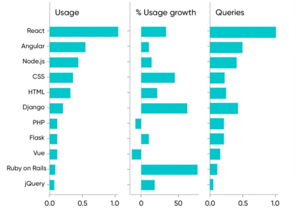 那么 Web 框架的世界是什么样的呢?React在内容使用方面处于领先地位,并且也显示出显着增长(同比增长34%)。尽管有传言说 Angular 正在衰落,但它是排名第二的平台,增长了10% 。而服务器端平台 Node.js 的内容使用率仅次于 Angular,增长了15% 。