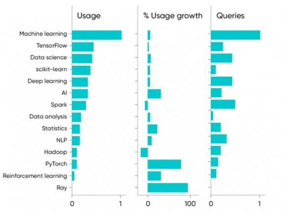 那么数据科学呢?这份报告《什么是数据科学》已经出版了10年。但令人惊讶的是,对于一篇 10 年前的论文来说,该报告的浏览量比 2019 年增长了 142% 。但是工具已经发生了变化,十年前,Hadoop 是数据科学世界的中心,现在它仍然存在,但是只是一个遗留系统,自 2019 年以来下降了23% 。Spark 现在是占主导地位的数据平台,而且它肯定是工具工程师们想要了解的。Spark 内容的使用大约是 Hadoop 的三倍。但即使是 Spark,自去年以来也下跌了 11% 。Ray 是新出现的,有望让构建分布式应用程序变得更加容易,但是还没有显示与 Spark(甚至 Hadoop)匹配的使用情况,但是它显示了 189% 的增长。还有一些其他的工具即将出现,比如,Dask 比 Ray 更新,并且增长了近400% 。