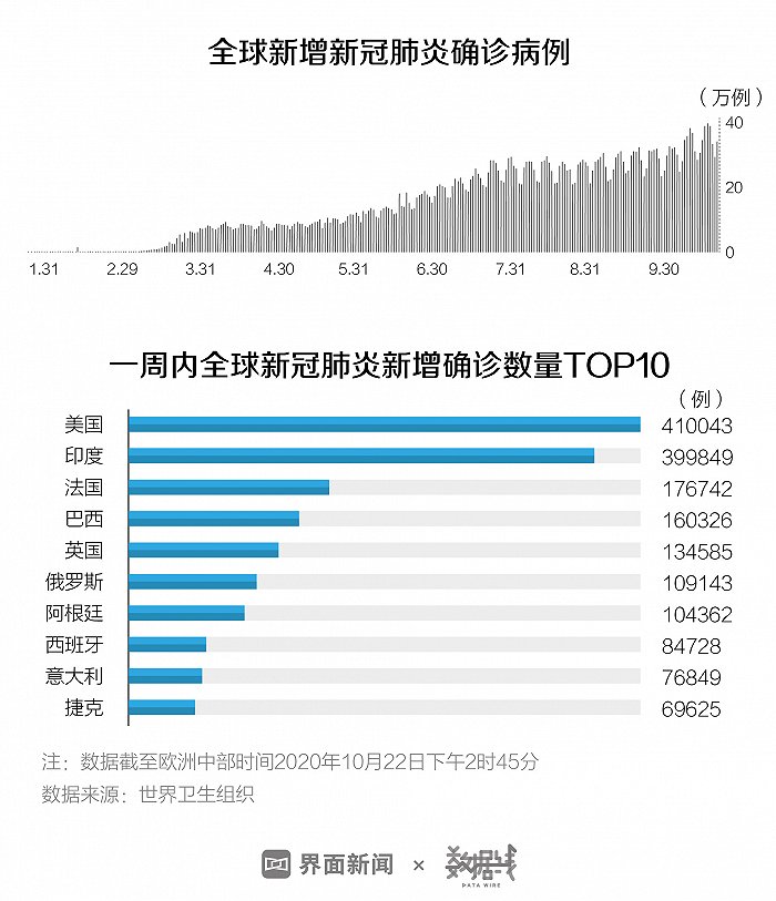 世界卫生组织最新数据(截至欧洲中部时间10月23日下午3时34分)显示,10月23日全球新增确诊病例为445419例,是9月30日(新增确诊病例254431例)的1.75倍,创历史新高。据界面数据不完全统计,目前10月全球新增病例平均为34.8万例/日,这一数据高于9月全球新增确诊病例的最高值(32.7万例/天)。