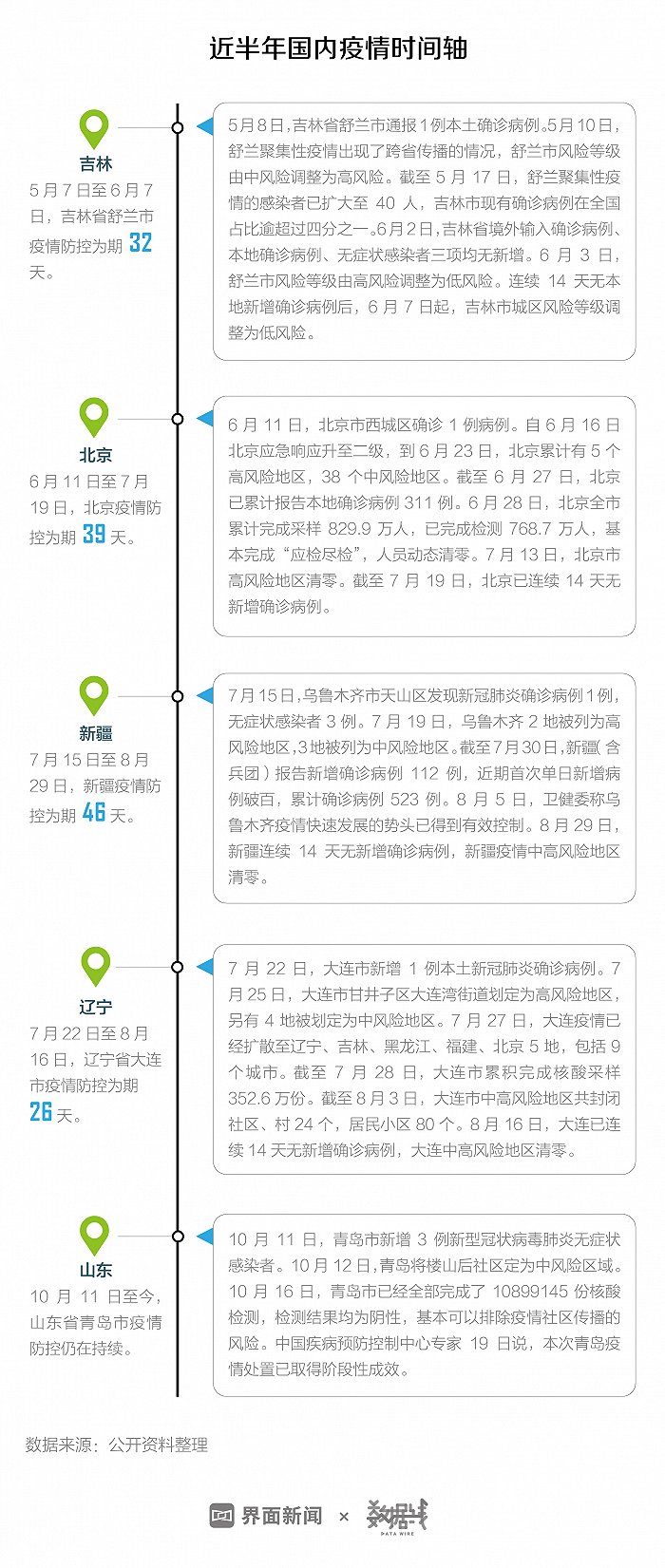 近半年,国内疫情在吉林、北京、新疆、辽宁、山东5地出现反复。据界面数据不完全统计,除山东省青岛市疫情尚未结束,其余4地疫情平均持续时间约为35天。