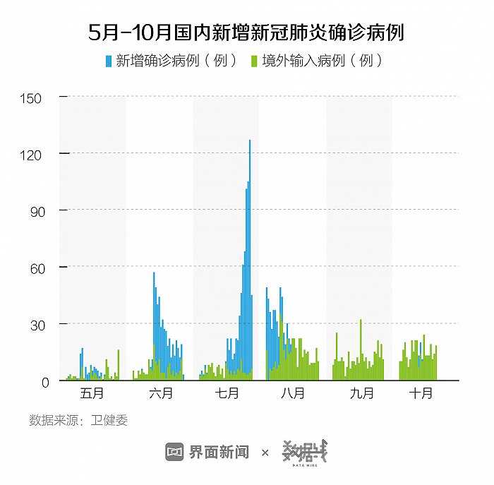 根据国家卫健委数据显示,中国面临的境外疫情输入压力持续加大。据界面数据统计,截至10月22日24时,10月新增确诊病例333例,其中境外输入病例320例,占比超过96%。同时,9月国内新增确诊病例356例,均为境外输入病例。