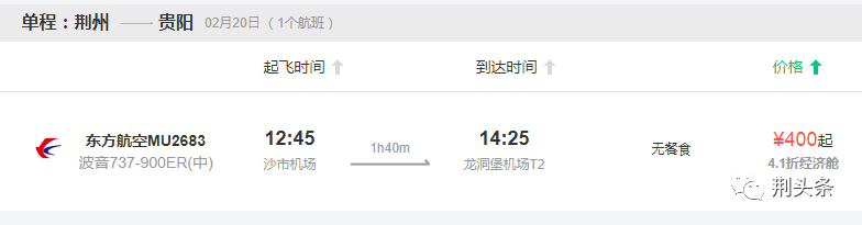 荆州至贵阳航班为东方航空MU2683