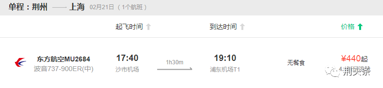 荆州至上海航班为东方航空MU2684