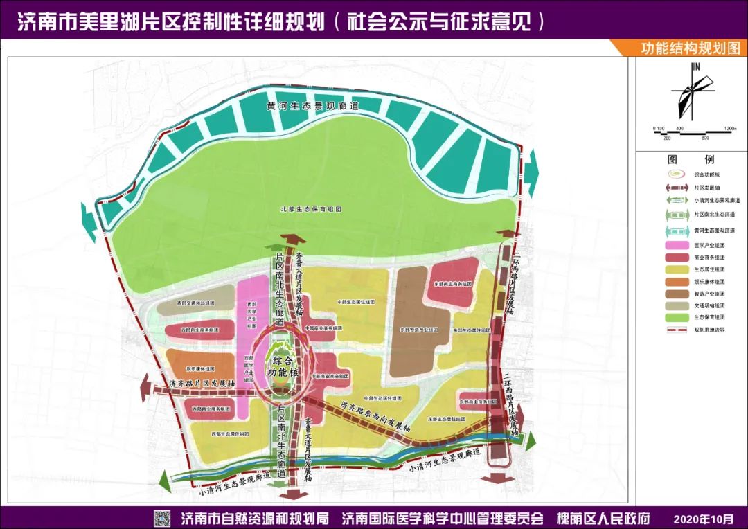规划形成为“核心引领、廊带串联、组团融合、平衡发展”的布局结构,整体形成“一核三廊三轴多组团”的发展格局。“核”:片区中心的综合功能核;“廊”:沿黄河生态景观廊道、片区南北生态廊道、小清河生态景观廊道;“轴”:沿齐鲁大道、二环西路、济齐路形成的片区发展轴;“组团”:依托现有和规划功能用地形成的医学产业、商业商务、生态居住、娱乐康体、生态保育、智造产业等主题功能组团。