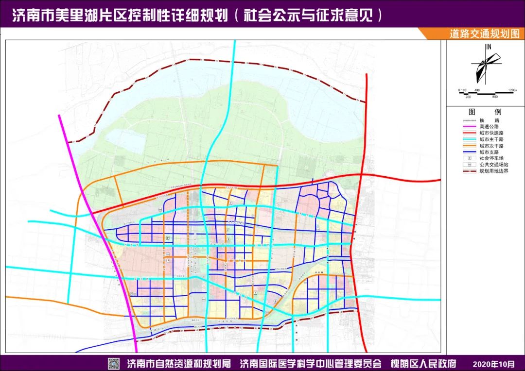本片区道路分为主干路、次干路、支路三个等级。规划城市主干路6条,为美里路、治黄路、济齐路、齐鲁大道、腊山河西路和机场路;规划次干路12条。规划1处高速出入口,为济南天桥出入口。