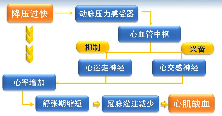 因为血压已经高了一阵儿了,身体有些方面已经调节适应了血压高的状态,猛地一降低,就会引起身体里一些脏器供血的改变。比如,可以引起反射性的心率加快,就会缩短心脏的舒张期,就会造成包括心肌在内的一些脏器供血不足。