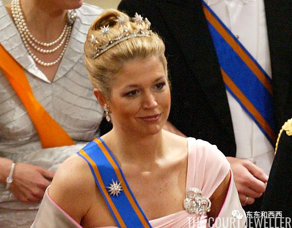 上面的珍珠换成钻石星星,星星原本是几百年前爱玛王后的胸针,如今镶嵌在王冠顶端。马克西玛婚后也戴过好几次↓↓