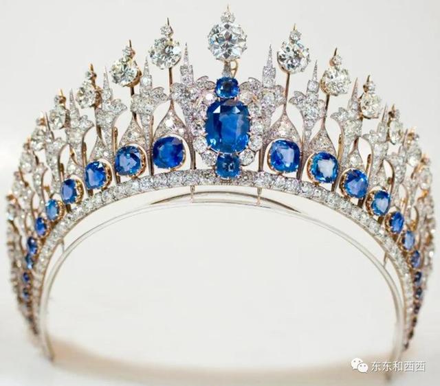 麦兰瑞蓝宝石王冠更加巨型,哥特式风格王冠,由近44克拉斯里兰卡蓝宝石和600颗钻石镶嵌而成,其中有些钻石用金属线镶嵌以达到抖动闪烁效果。简单说,就是一座蓝宝石和钻石的火焰山↓↓