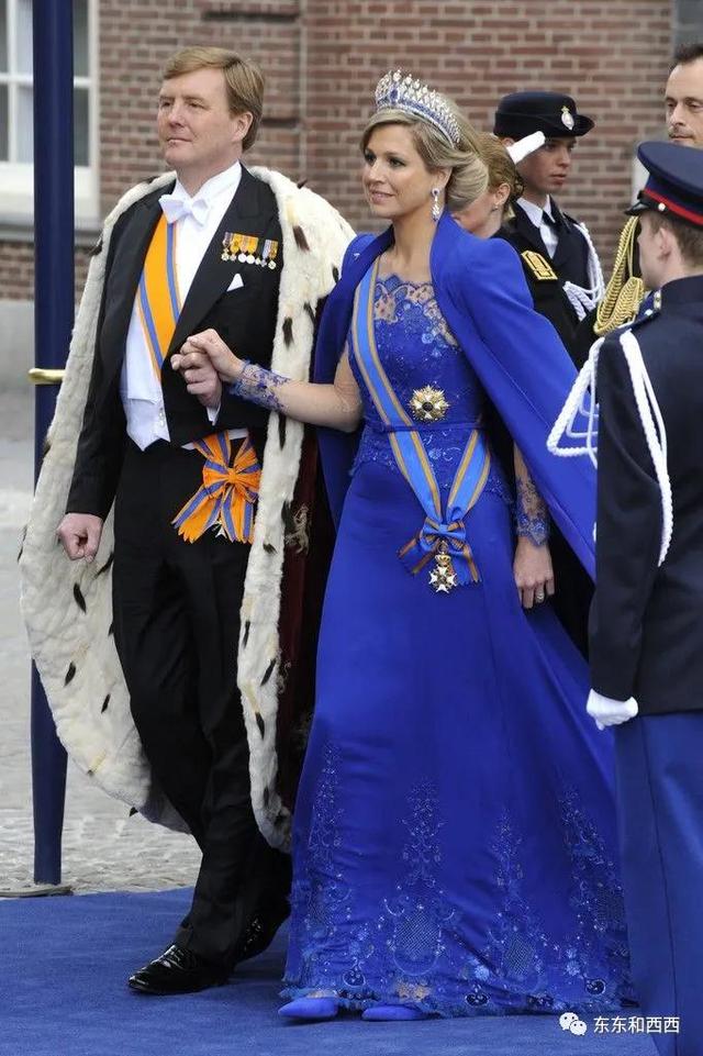 2013年的登基典礼上佩戴全套皇家蓝,穿荷兰顶尖设计师Jan Taminiau量身定制的宝蓝色礼服↓↓