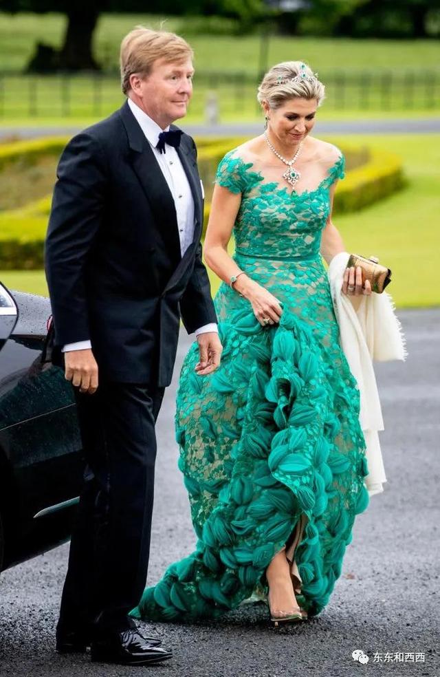 马王后访问爱尔兰时,因为爱尔兰有“绿宝石岛”的美誉,她佩戴祖母绿珍珠头饰搭配翡翠绿礼服↓↓