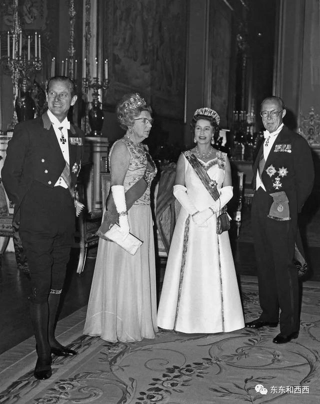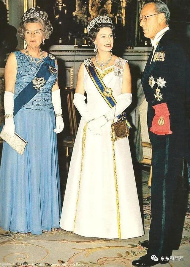 1972年,荷兰女王朱莉安娜戴斯图尔特钻石王冠访问英国。英国女王比她小一辈,戴着俄罗斯公爵夫人王冠,当中镶嵌珍珠↓↓