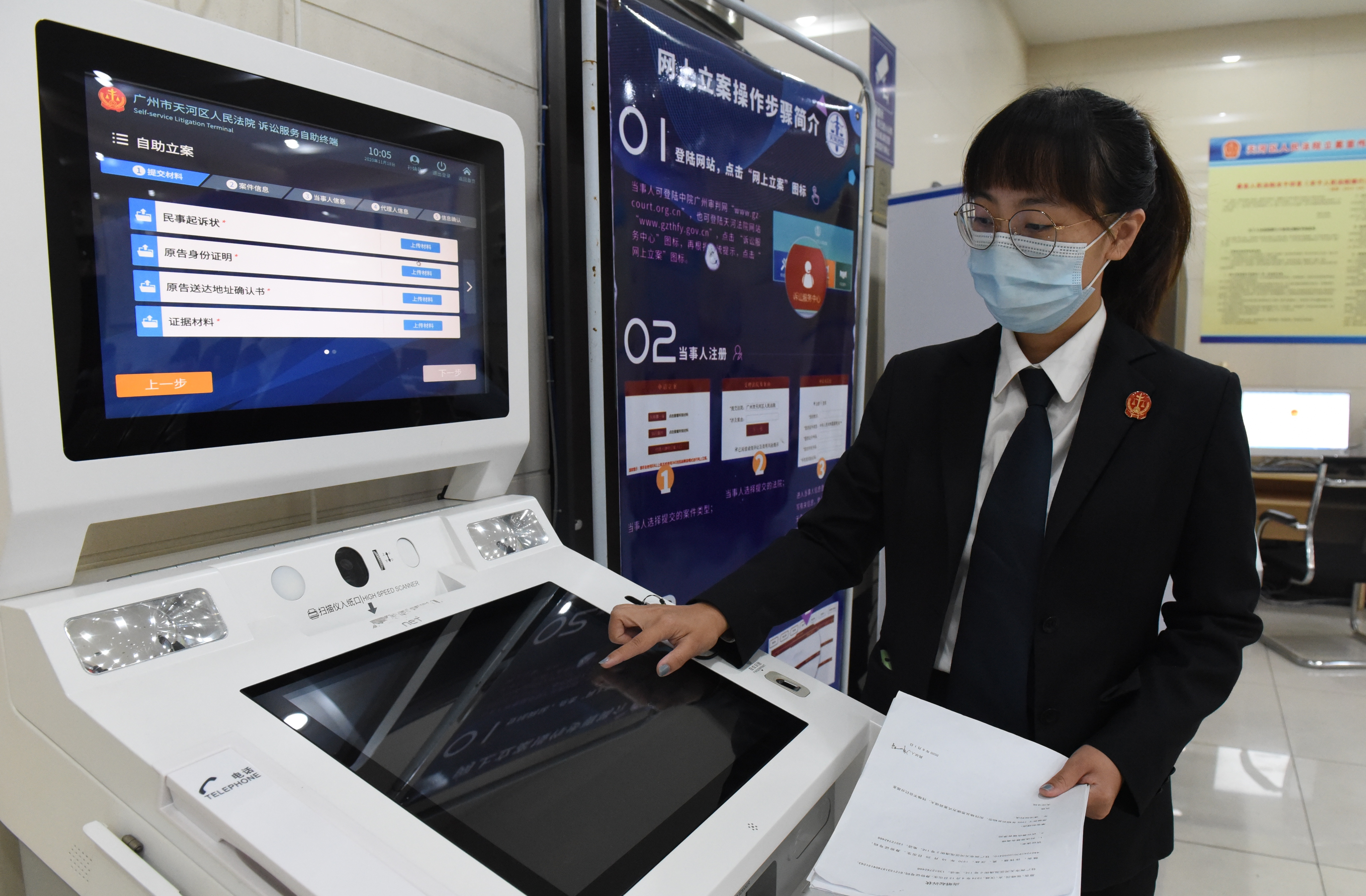 走进天河区人民法院诉讼服务中心,除了在15个窗口前办事的市民,两台诉讼服务自助终端非常显眼。在这两台类似于银行“ATM”机的终端上,当事人不仅可以实现自助立案,还可以实现案件查询、自助阅卷、诉讼引导、失信人查询、诉讼费计算等功能,非常便捷实用。