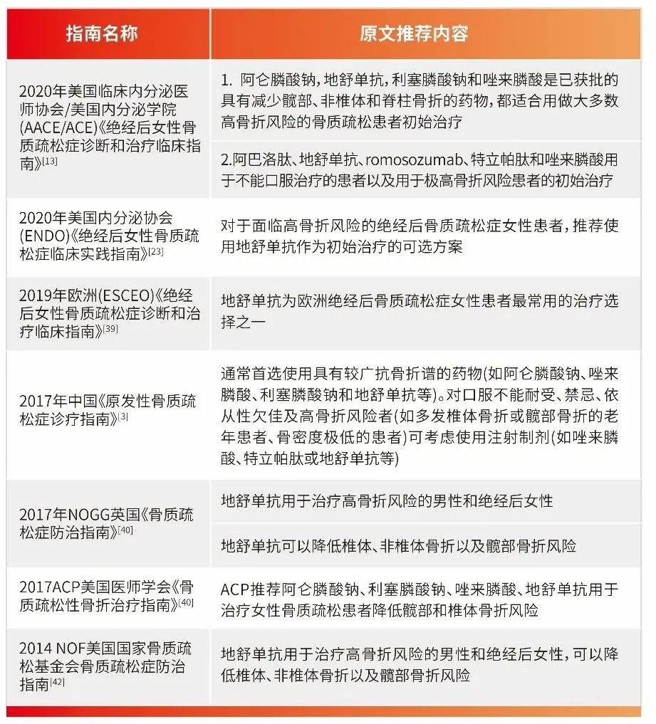 目前国内外绝经后骨质疏松症诊疗指南已经将地舒单抗作为抗骨质疏松初始治疗的推荐之一(见表2)。