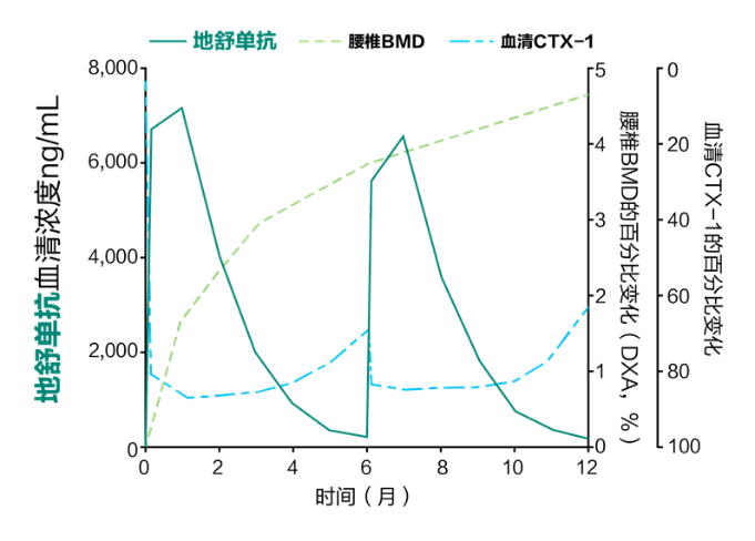 地舒单抗60mg注射以后,骨吸收标志物血清CTX水平在第3天下降约85%,1个月左右达到最大下降幅度。