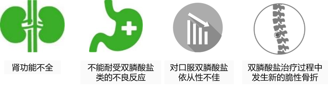 既往应用过双膦酸盐治疗的患者可以转换成地舒单抗治疗,特别是如下情况可考虑转换: