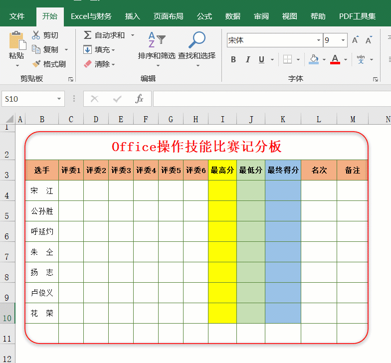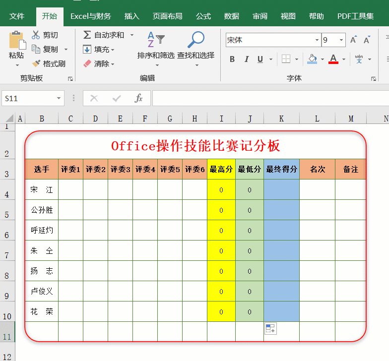 今天阿钟老师分享一个用Excel制作的记分系统,当录入评委亮出的分数后,就可以得出去掉最高分、最低分后的平均得分,而且最后一名选手得分出来后,名次也同步得出。