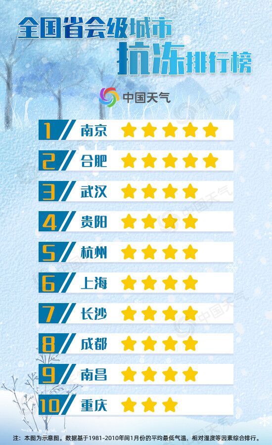 最抗冻的“不南不北地区”还可以细分为海派湿冷、楚派湿冷、川派湿冷等区域。那么究竟哪个区域是抗冻属性最高的“最中之最”呢?中国天气网选取省会级城市作为代表,通过隆冬季节的平均最低气温、相对湿度等因素来综合排名,江苏南京、安徽合肥抗冻指数为五颗星,为最抗冻城市。