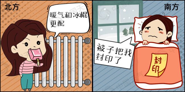 网友调侃“你在北方的暖气里吃冰棍,我在南方的被子里瑟瑟发抖”、“北方御寒只是装备好,南方人抗冻才是属性高。”